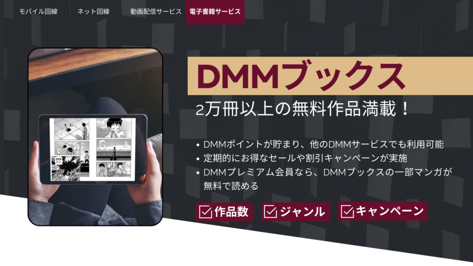 DMMブックスは、幅広いジャンルの本を98万冊以上取り揃えた電子書籍サービスです。2万冊以上の無料作品も常時提供されており、課金なしで充分な満足が得られるでしょう。